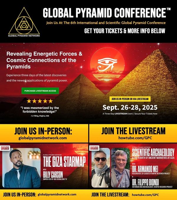 Can’t attend in person? Experience the 6th International & Scientific Global Pyramid Conference from anywhere in the world with our exclusive livestream on HowTube. Step into three days of pyramid science, sacred geometry, cosmic alignments, and consciousness research, featuring world-renowned speakers and transformative experiences—all from the comfort of your home. Livestream Access – includes lifetime replay so you can revisit every session anytime.